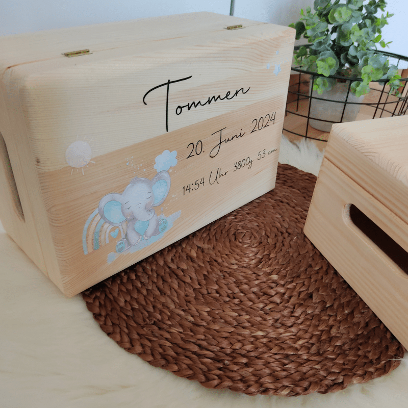 Auf Wunsch wird die Erinnerungskiste personalisiert mit Name, Geburtsdatum und Geburtsdaten des Kindes. Das Motiv ist frei wählbar, sodass jede Box zu einem ganz persönlichen Unikat wird.